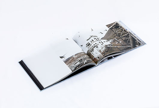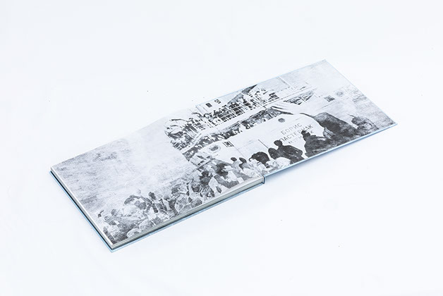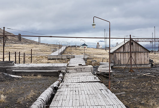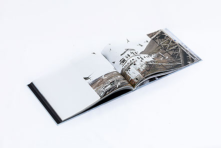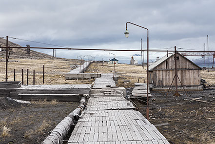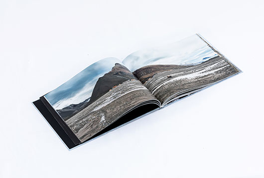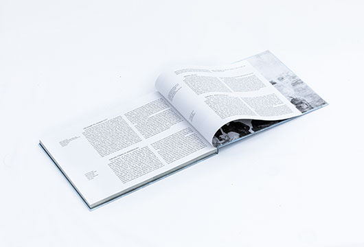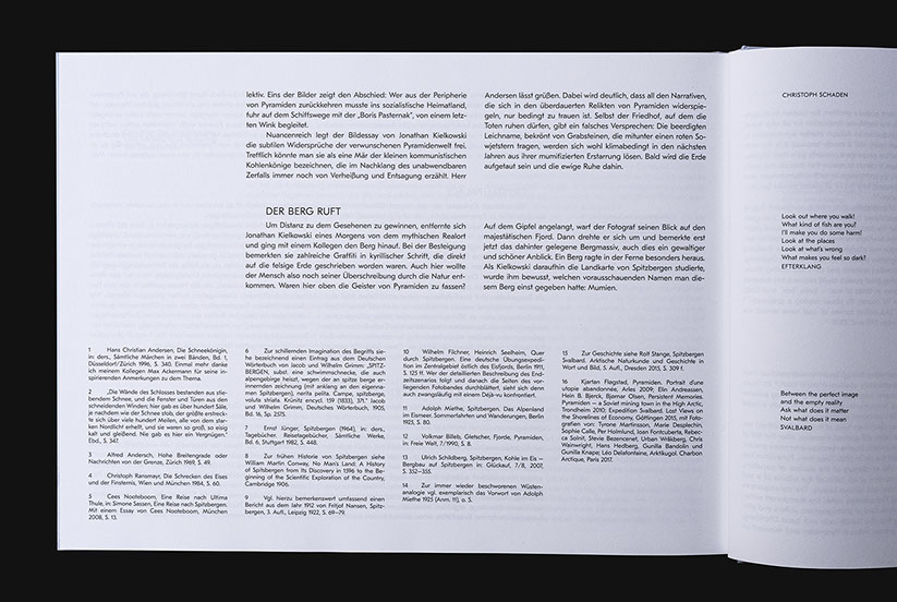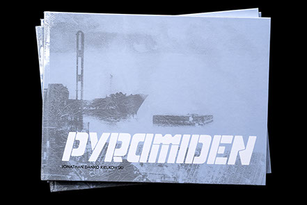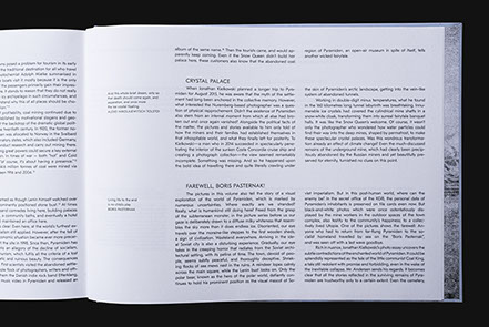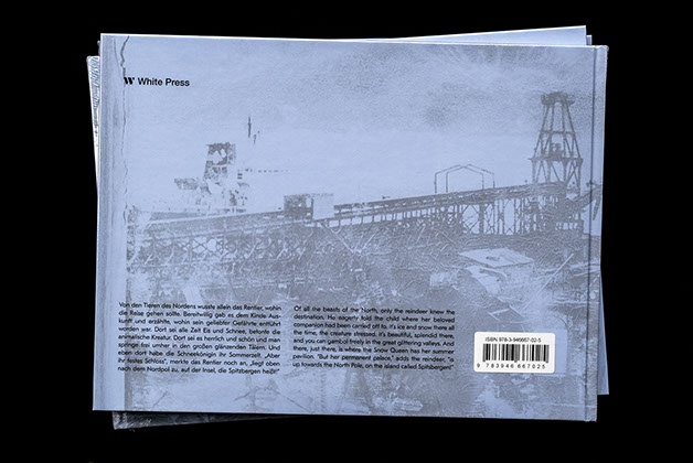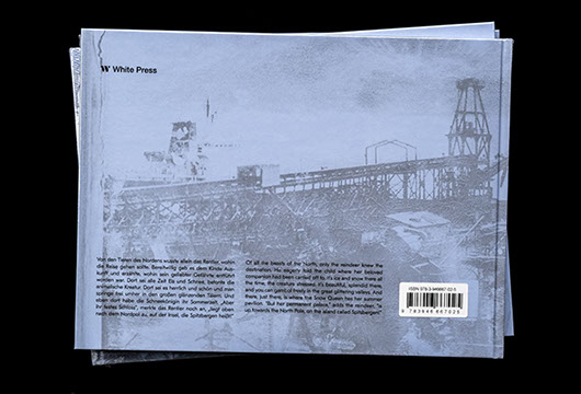 Jonathan Danko Kielkowski's photo book features images of the world's northernmost coal mine and the former Soviet coal settlement Pyramiden on Spitsbergen, which is abandoned since the late 1990s. The cover's typography is a replica of a stencil lettering from inside the coal mine, which, like the Pyramiden settlement itself, is enclosed in Arctic ice blue. Using the grotesque font "GT Eesti," which had its origins in the 1940s Soviet Union, the text section of the book resembles the purist constructions of abandoned Soviet architecture. The book was published to accompany an exhibition at the »Forum für Fotografie« in Cologne in January 2019.