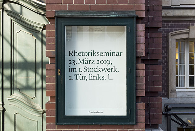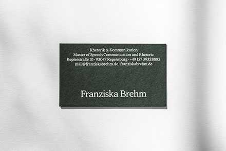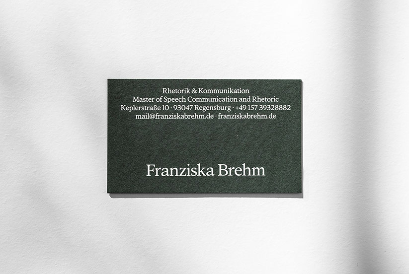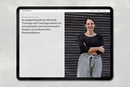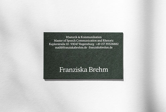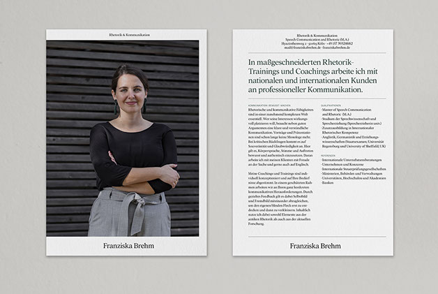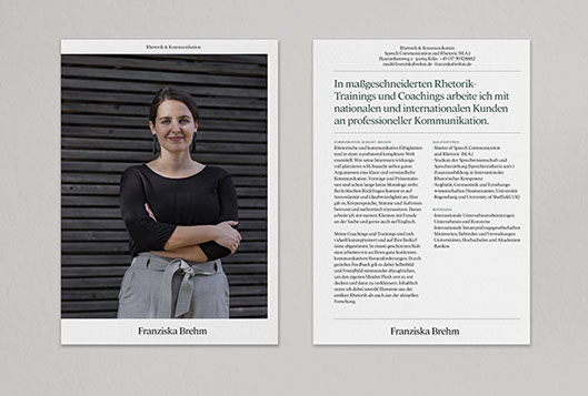 Franziska Brehm leads rhetoric seminars and works with national and international clients on professional communication. For her visual identity, we focused on her essential working tool, the spoken word, and worked with purely typographic design elements. A soft, clear imagery as well as a characterful, elegant corporate color accompany the textual design.