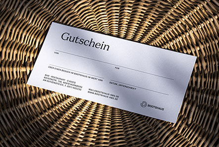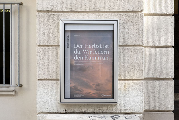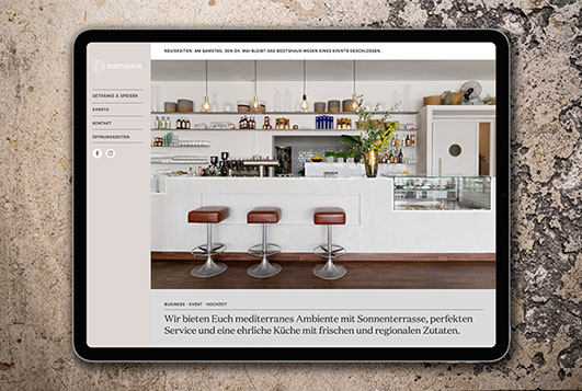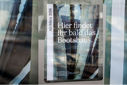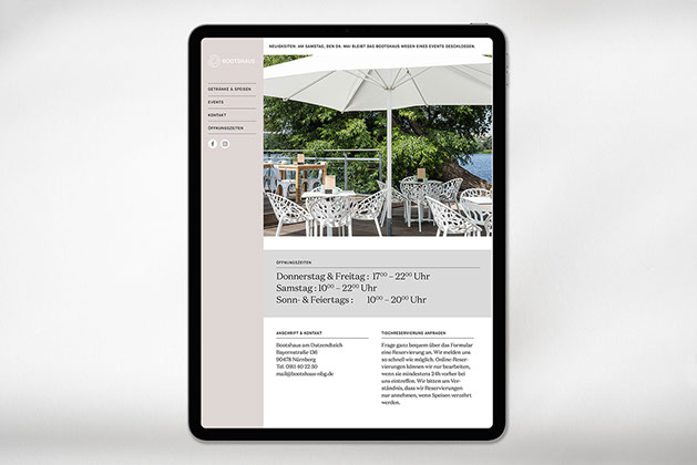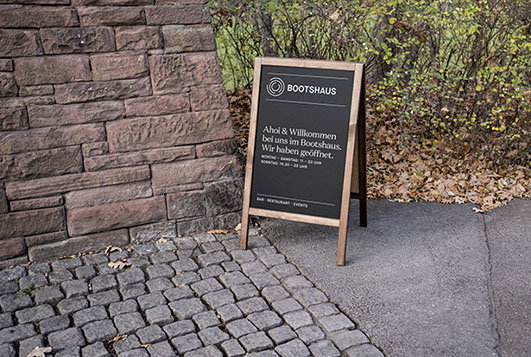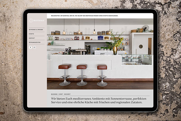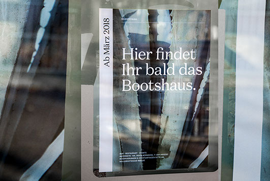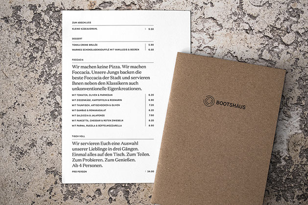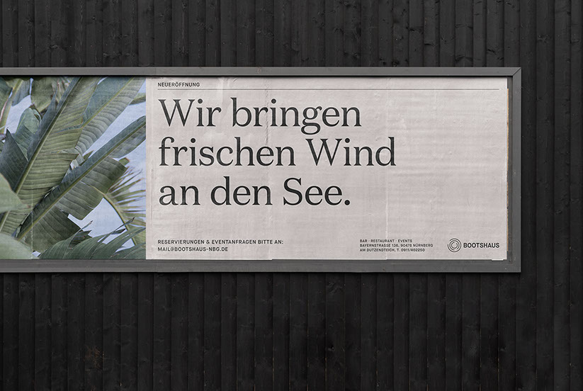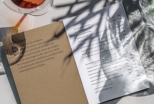 Bootshaus is a restaurant with a lakeside terrace on the banks of Nuremberg's Dutzendteich lake. For the opening in spring 2018, we developed a design concept that combines the maritime esprit and natural chic of the light-flooded location with lake view. The logo features a circular spreading wave shape as a reference to the waterfront location. Kraft cardboard and natural papers create tactile naturalness while the elegant shapes of the font "Domaine" exude a certain savoir-vivre. Warm light and Mediterranean flora characterize the accompanying photographic imagery.