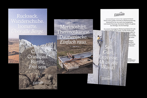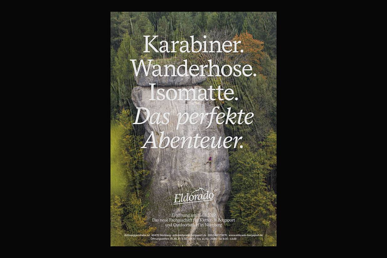 Since its opening in spring 2019, the mountain sports store has become an authority for climbing and outdoor supplies in Nuremberg. We accompanied the team around the owner Tobias Plail from the beginning and developed an independent visual language that puts "being outdoors" and the passion for alpine sports in the center of the identity. All printed matter and advertising materials are based on Tobias' nature and climbing photographs. For the design we oriented ourselves on alpine guides, hiking maps and climbing topos of the 1970s and 80s. Accompanying the opening, we designed a campaign that was spread via posters and postcards.