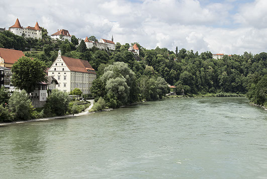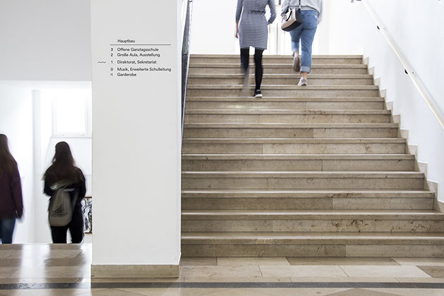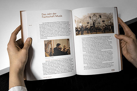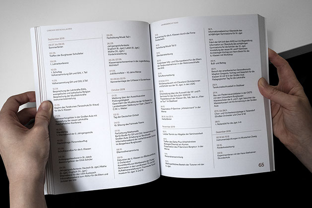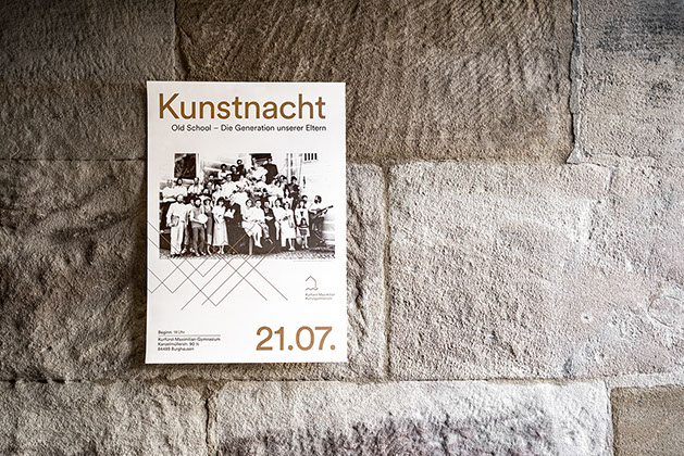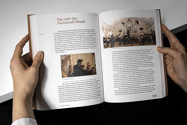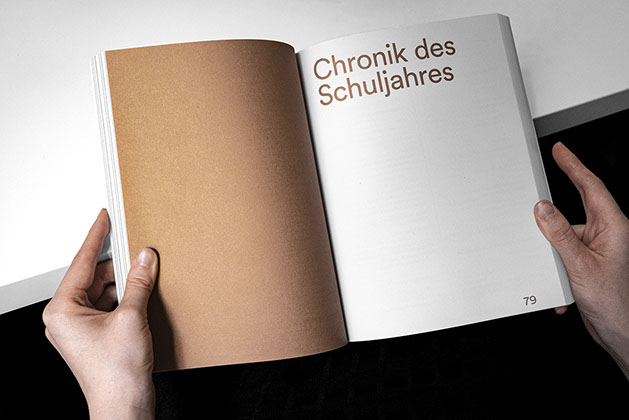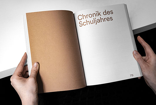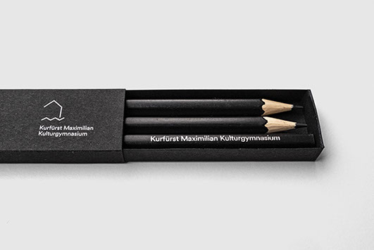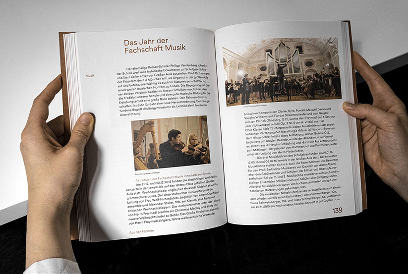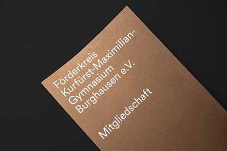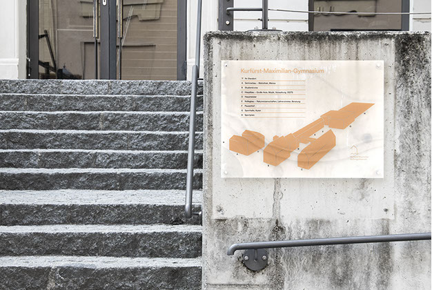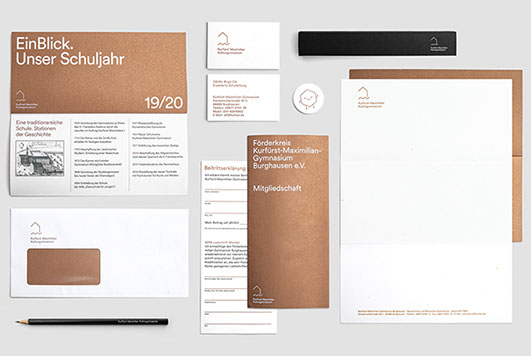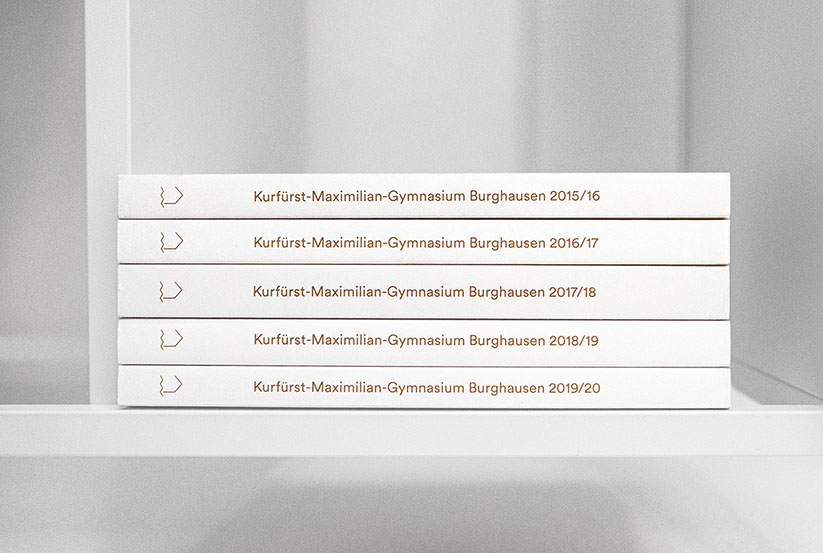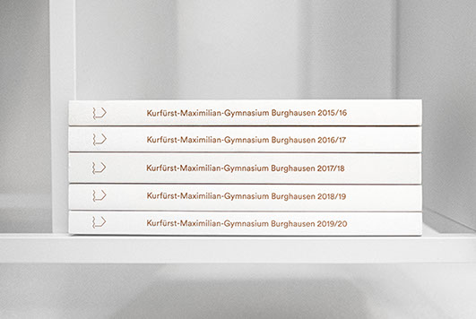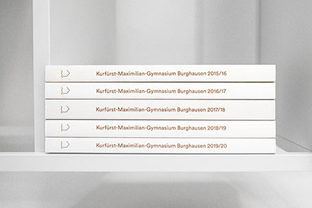 Founded in 1629, the Kurfürst Maximilian Gymnasium in Burghausen is one of the oldest schools in Bavaria. Since 2016, we have been accompanying the school on the river on its way to becoming a »cultural high school«. Together with the newly designed logo, which refers to the school's location directly on the Salzach river, we developed a clear, balanced identity. It combines the school's traditional history and historical architecture with modern school life in the form of clear typography, copper color areas, white uncoated paper and graphic comb and wave structures. We created a consistent visual design system that allows students and teachers alike to identify as a vibrant and stable community. Our design work included print and promotional materials, website, social media, school textiles, school mascots, annual reports, and an orientation system for the large-scale school campus.